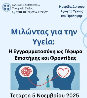 Η 2η Υγειονομική Περιφέρεια Πειραιώς και Αιγαίου πραγματοποίησε την Τετάρτη 5 Νοεμβρίου 2025, στο Αμφιθέατρο του Κτηρίου Κεράνης, την ετήσια ημερίδα του Δικτύου Αγωγής Υγείας και Πρόληψης με τίτλο «Μιλώντας για την Υγεία: Η Εγγραμματοσύνη ως Γέφυρα Επιστήμης και Φροντίδας». Η φετινή θεματική επικεντρώθηκε στην Εγγραμματοσύνη Υγείας ως βασικό εργαλείο πρόληψης και προαγωγής υγείας, αναδεικνύοντας […]