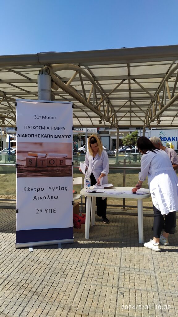 Με αφορμή την Παγκόσμια Ημέρα Διακοπής του Καπνίσματος, διοργανώθηκε από το Κέντρο Υγείας Αιγάλεω, δράση ενημέρωσης και ευαισθητοποίησης του κοινού στη Πλατεία Εσταυρωμένου, έξω από το σταθμό Μετρό Αιγάλεω, για τις επιπτώσεις του καπνίσματος (ενεργητικού, παθητικού), αλλά και για τα οφέλη από τη διακοπή του. Ταυτόχρονα, έγινε διανομή έντυπου ενημερωτικού υλικού σχετικά με τους μύθους γύρω από το κάπνισμα, τις επιπτώσεις αλλά και για την λειτουργία των ιατρείων διακοπής καπνίσματος στην Αττική. Αρκετοί πολίτες συμπλήρωσαν το ερωτηματολόγιο της κλίμακας Fagerstrom, σχετικά με το «Test εξάρτησης από τη νικοτίνη», με μεγάλο ποσοστό να υπερβαίνει τους 7 βαθμούς (βαθμός εξάρτησης: ΠΟΛΥ ΕΞΑΡΤΗΜΕΝΟΣ).