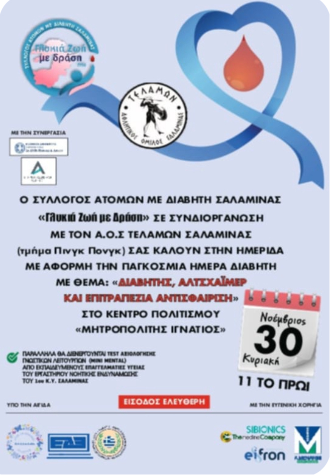 Με αφορμή την Παγκόσμια Ημέρα για το Διαβήτη, το 1ο Κέντρο Υγείας Σαλαμίνας συνεχίζοντας τις δράσεις ενημέρωσης και ευαισθητοποίησης του πληθυσμού  ευθύνης του και σε συνεργασία με τον Σύλλογο Διαβητικών Σαλαμίνας «Γλυκιά Ζωή με δράση» συμμετέχει στη δράση σχετική με το Σακχαρώδη Διαβήτη, τη νόσο Αλτσχάιμερ  και την αντισφαίριση.  Κατά τη διάρκεια της εκδήλωσης εκτός από μετρήσεις γλυκόζης αίματος και Αρτηριακής Πίεσης, θα διενεργούνται και tests αξιολόγησης γνωστικών λειτουργιών (mini mental) από εκπαιδευμένους επαγγελματίες υγείας του Εργαστηρίου Νοητικής Ενδυνάμωσης του 1ου Κέντρου Υγείας Σαλαμίνας.