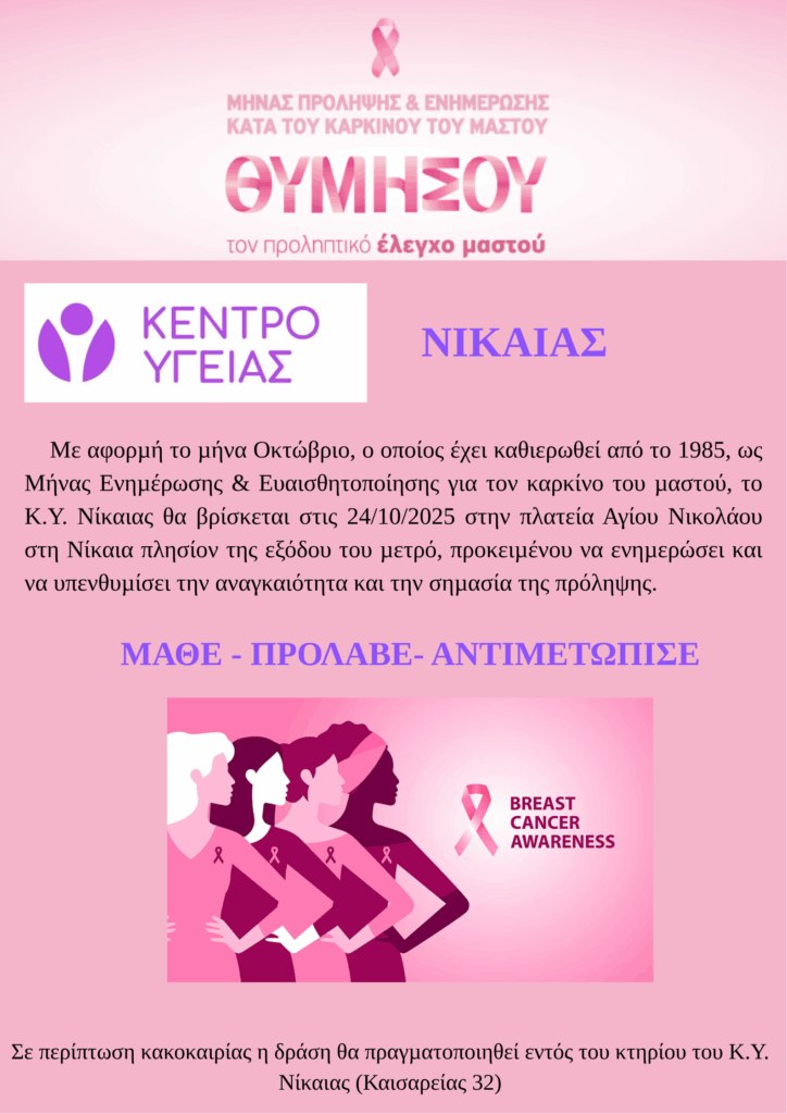 Δράση ενημέρωσης / ευαισθητοποίησης του Κ.Υ. Νίκαιας για τη πρόληψη του καρκίνου του μαστού στις 24/10/2025