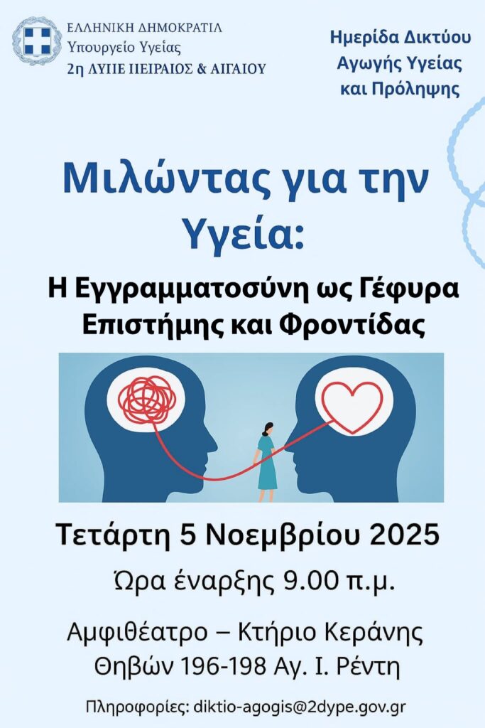 Η 2η Υγειονομική Περιφέρεια Πειραιώς και Αιγαίου πραγματοποίησε την Τετάρτη 5 Νοεμβρίου 2025, στο Αμφιθέατρο του Κτηρίου Κεράνης, την ετήσια ημερίδα του Δικτύου Αγωγής Υγείας και Πρόληψης με τίτλο «Μιλώντας για την Υγεία: Η Εγγραμματοσύνη ως Γέφυρα Επιστήμης και Φροντίδας».